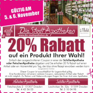 Sparen Sie jetzt in der FetscherApotheke am Fetscherplatz, SchillerApotheke am Schillerplatz und StadtApotheke an der Prager Straße! Reinschauen lohnt sich, es gibt wöchentlich neue Spar-Coupons, die Sie in allen 3 Apotheken einlösen können.