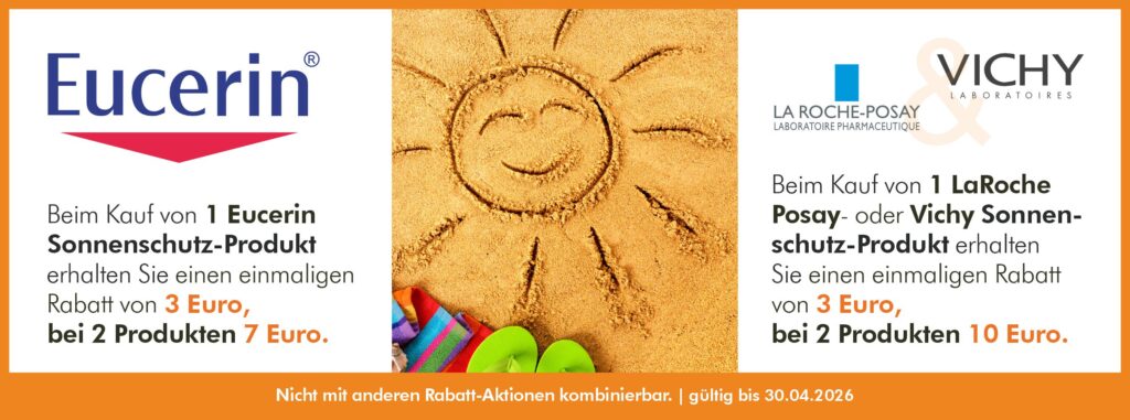 Beim Kauf von 1 LaRoche Posay- oder Vichy Sonnenschutz-Produkt erhalten Sie einen einmaligen Rabatt von 3 Euro, bei 2 Produkten 10 Euro.
